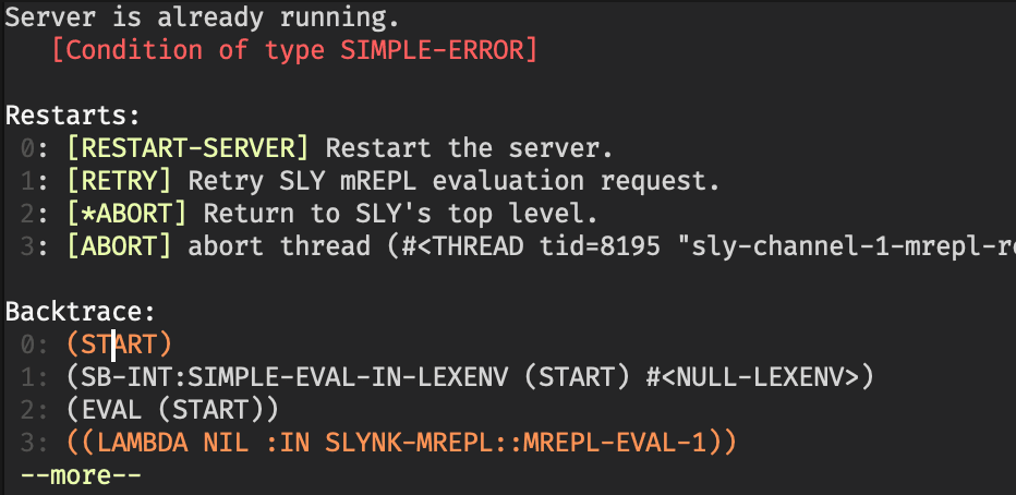 (stop))))In this portion of the code, I defined a restart action for the debugger. The Common Lisp debugger always has RETRY and ABORT actions for every exception raised. By declaring a restart-case, we are signalling an error and adding custom choices to the one offered by default by the debugger. The new option I added is called restart-server and if selected, it first (stop) the server and then restart the operation, so the function would run again without raising an error. It’s a smart way to interact with the REPL and improve the developer experience using the language directly.